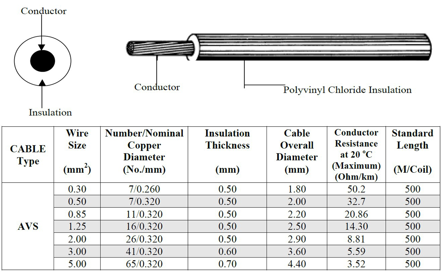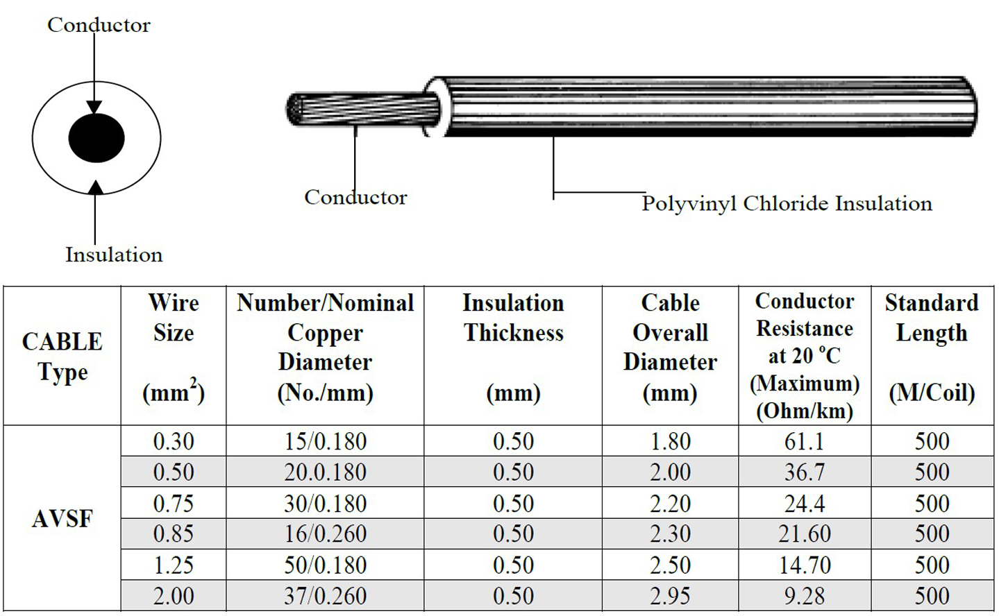 ประโยชน์การนำไปใช้ -วงจรความดันไฟฟ้าต่ำในรถยนต์(ยานพาหนะและมอเตอร์ไซน์) รายละเอียดผลิตภัณฑ์ - ตีเกลียวทองแดง ขนาด 0.30 – 5.0 mm2 - PVC ที่ใช้ผลิตฉนวนไม่มีสารเคมีที่เป็นอันตราย - มาตรฐานอ้างอิง : JASO D611